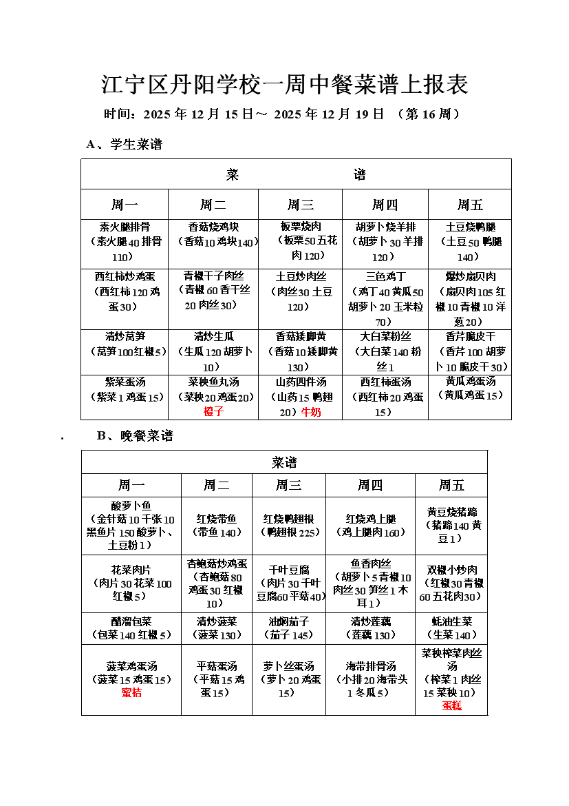 2025-2026学年度第一学期第16周菜谱